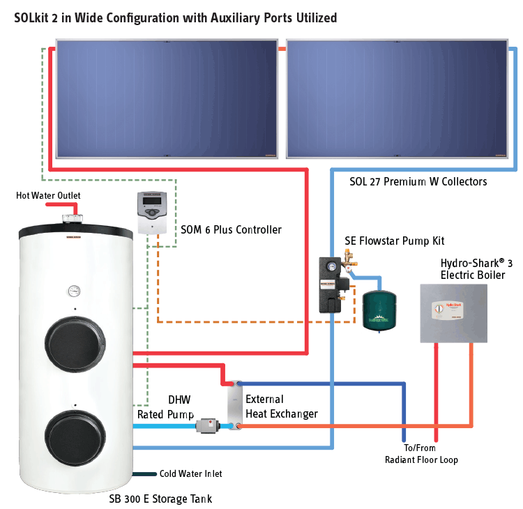 El sistema de respaldo se usa para añadir calor adicional al agua caliente doméstica, de ser necesario. Esta situación puede ocurrir, por ejemplo, un día nublado si el sistema solar no puede producir suficiente agua caliente para satisfacer la demanda o si no puede calentar el agua. Los tanques Stiebel Eltron SB-E en SOLkits tienen un respaldo eléctrico integral, pero otras soluciones posibles son los calentadores eléctricos sin tanque Stiebel Eltron Tempra® o los sistemas de respaldo existentes para sitios específicos.